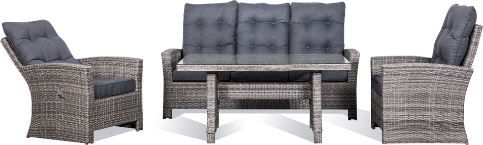 Liberty bietet Ihnen eine klassische Sofagruppe aus doppeltem halbrundem Kunstrattan / großem runden Kunstrattan. Die Farbe ist neutral, was bedeutet, dass sie in die meisten Außenumgebungen passt. Rahmen aus witterungsbeständigem Aluminium. Schöne Sitzkissen mit grauem Stoff bezogen. Die Sessel haben verstellbare Rückenlehnen. Hier können Sie viele faule Momente mit Familie und Freunden verbringen.