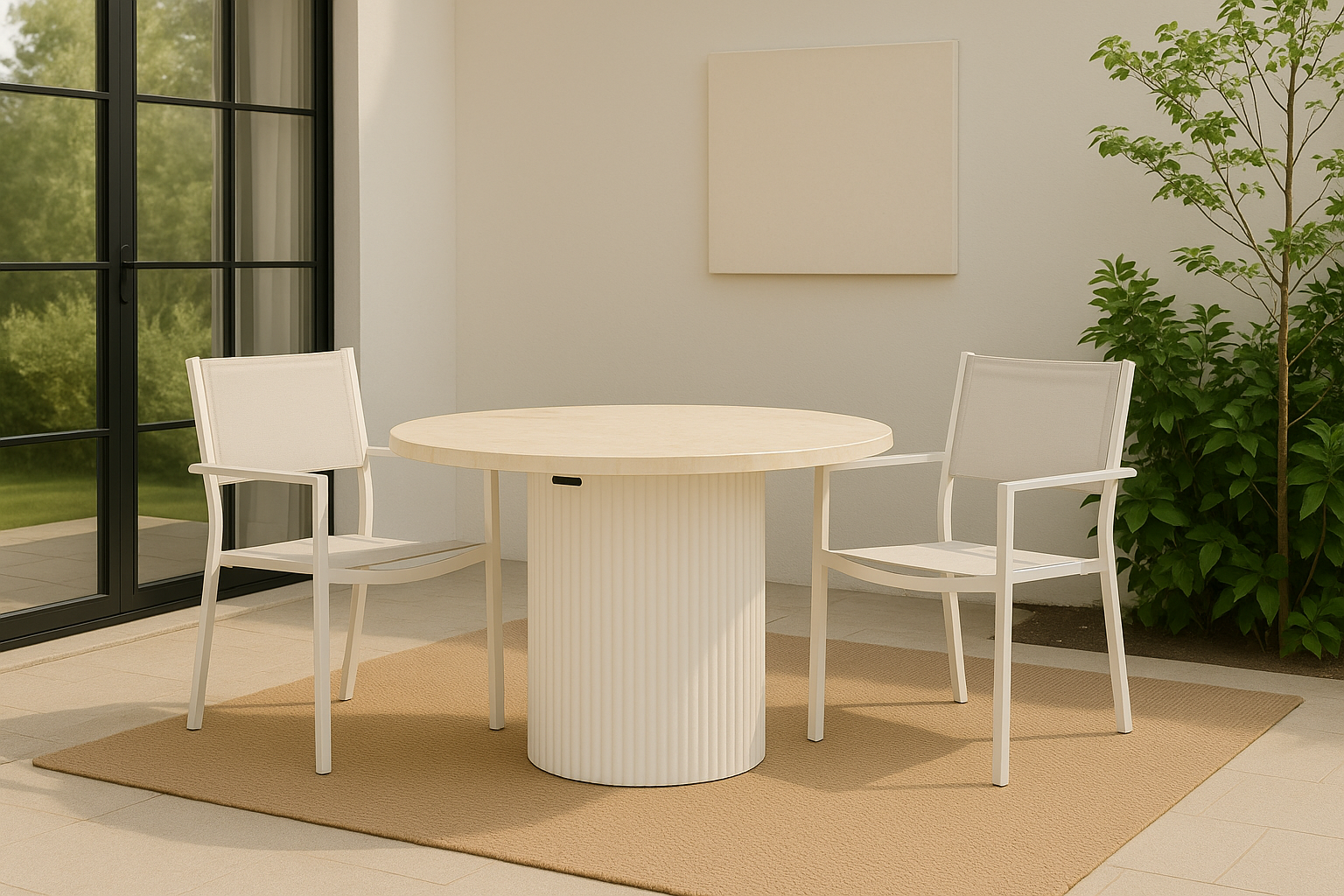 Merca-Gartentische vereinen elegantes Design mit praktischer Haltbarkeit für den Außenbereich. Die Tischplatte ist mit einem wetterbeständigen Aufdruck versehen, der wunderschönen Travertinstein imitiert und der Terrasse ein exklusives Flair verleiht. Die runde Form schafft eine einladende Atmosphäre und erleichtert das Zusammenkommen von Familie oder Freunden zu Mahlzeiten im Freien.