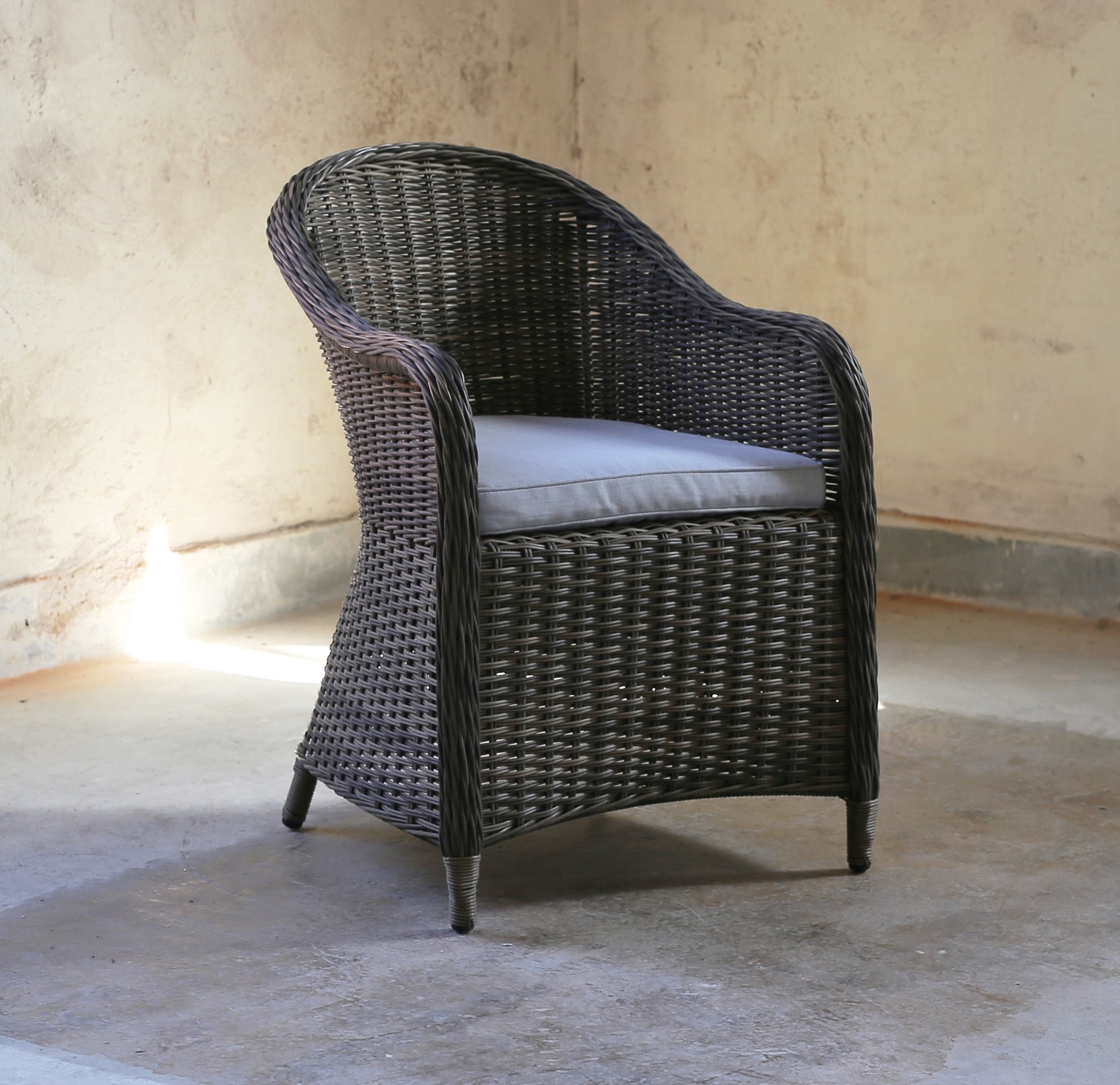 Mercury-Sessel aus braunem Kunstrattan mit grauem Stoffkissen.