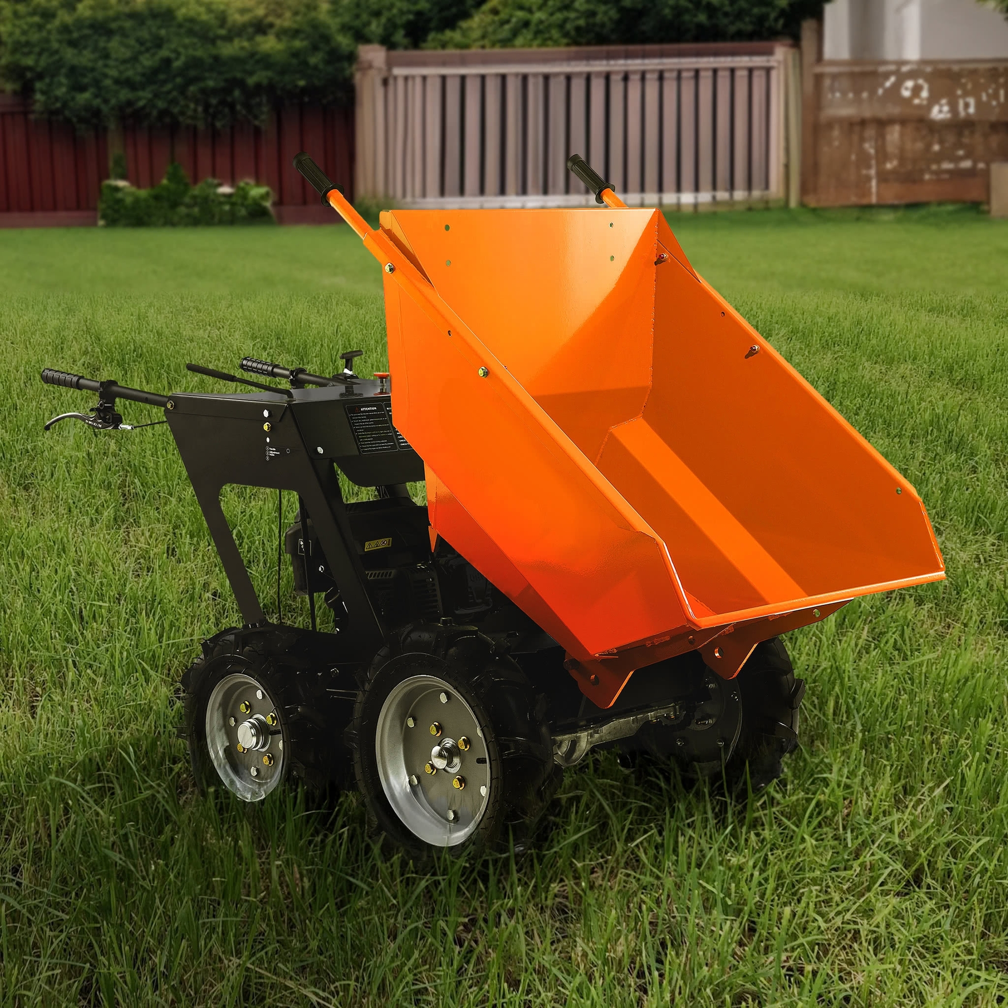 Mit vier robusten Gummirädern (vorne 4.00-10, hinten 4.00-8) ist der Dumper für das Manövrieren auf unebenen und anspruchsvollen Oberflächen geeignet und der Griff ist so konzipiert, dass er Ihnen maximale Kontrolle und Manövrierfähigkeit bietet.