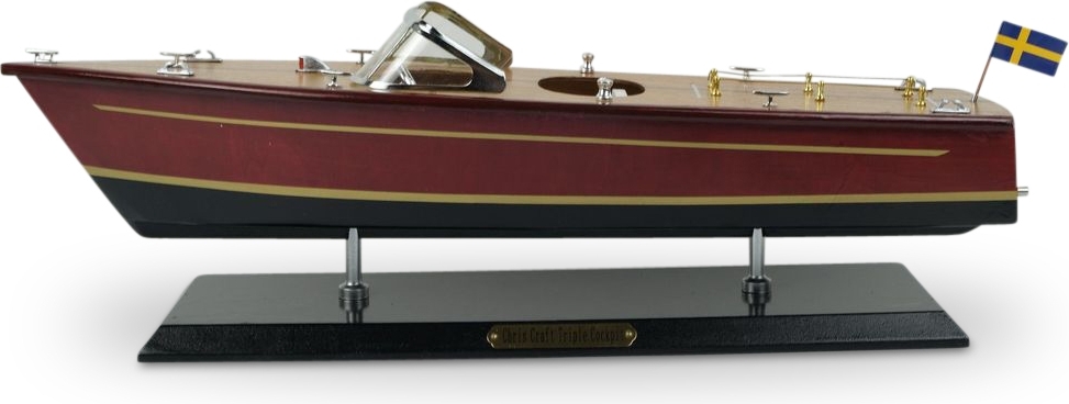 Modell eines klassischen Motorbootes aus massiver Kiefer in Mahagoni-Ausführung.
