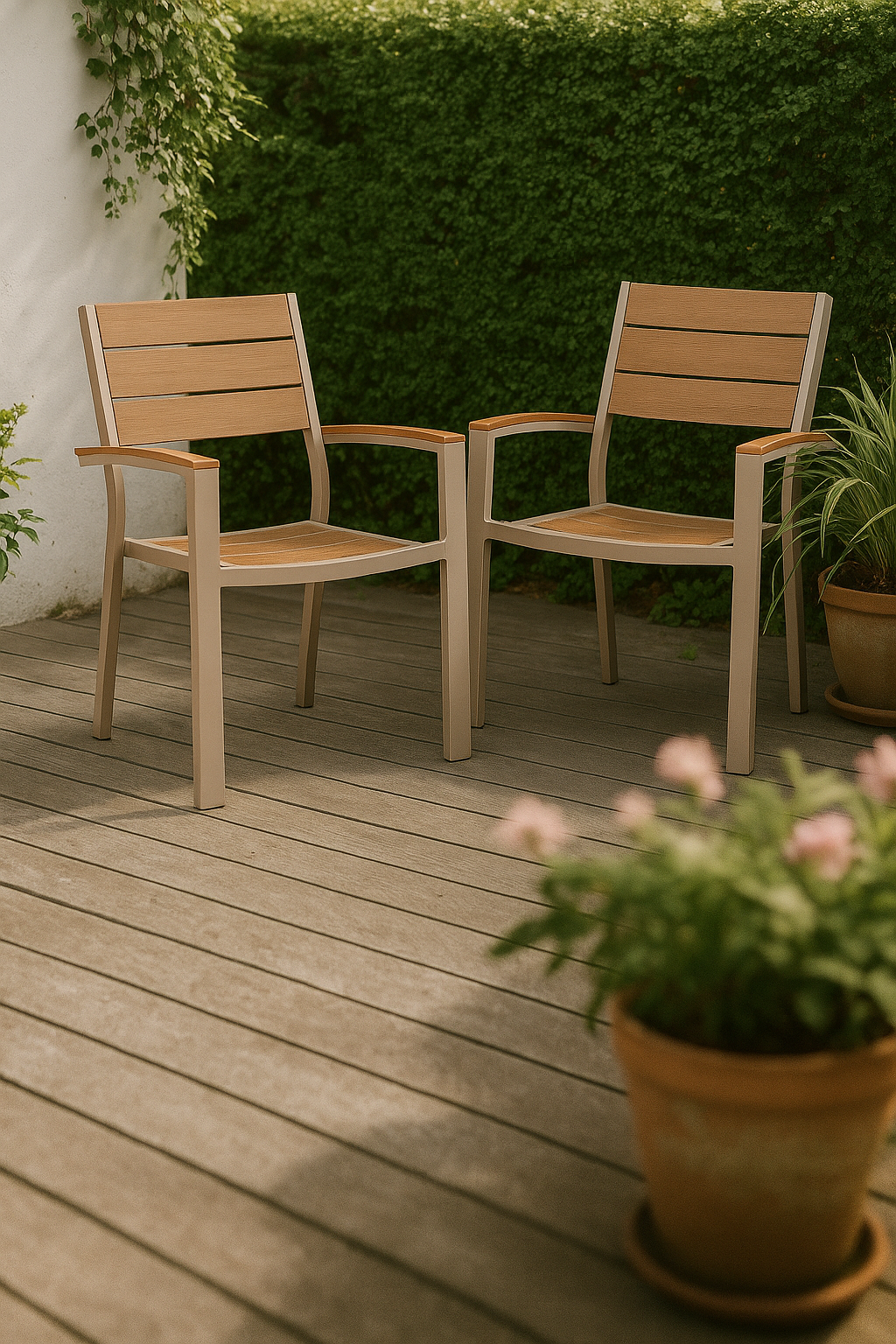 Der beige lackierte Aluminiumrahmen ist leicht, rostfrei und erfordert nur minimale Wartung. Noonwood ist ein langlebiges Kunststoffmaterial mit Holzhaptik, das Sonne, Regen und Temperaturschwankungen standhält. Perfekt für alle, die mehr Zeit mit Genießen und weniger mit Unterhaltung verbringen möchten.