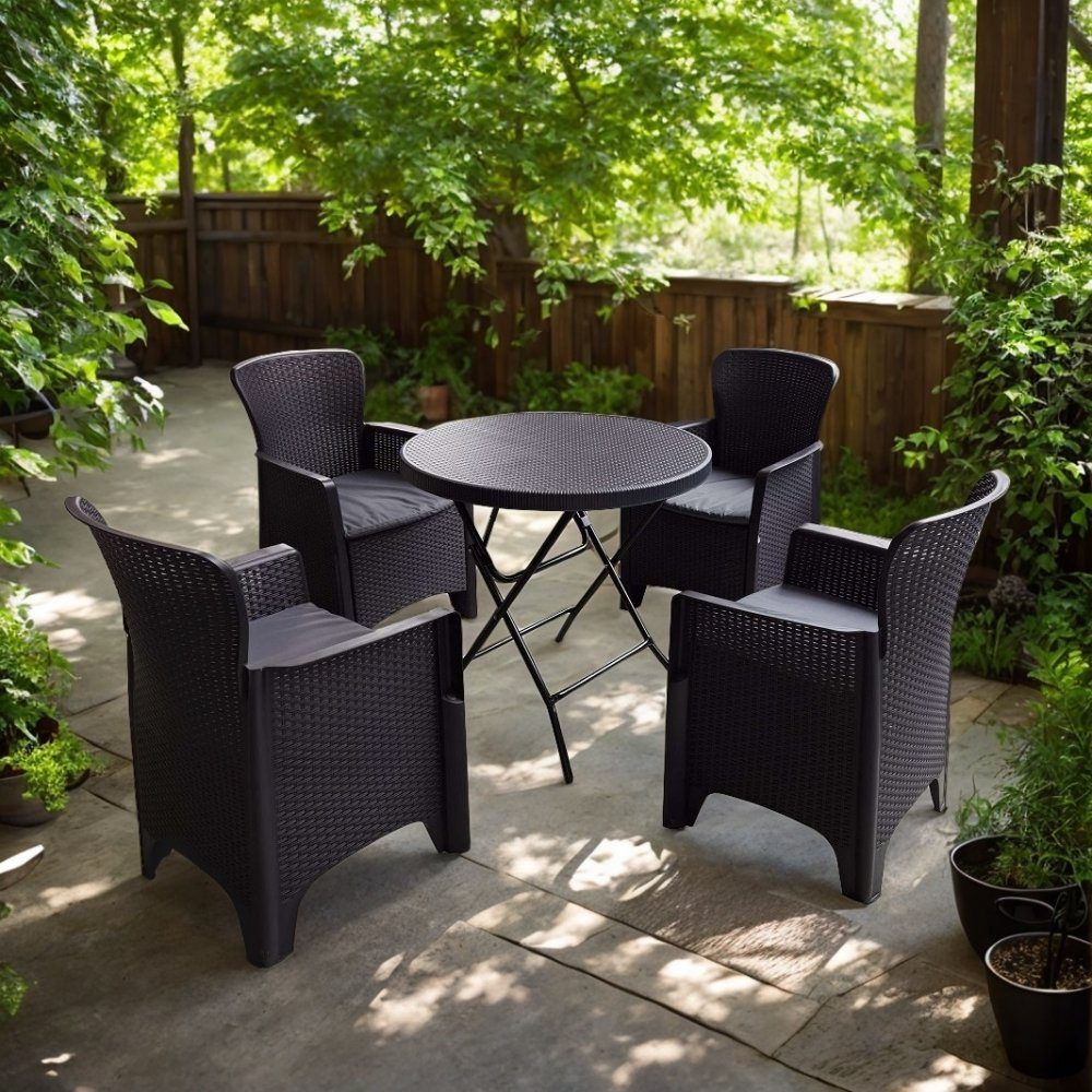 Im Lieferumfang enthalten sind 4 bequeme Sessel aus schwarzem Kunstrattan mit passenden dunkelgrauen Sitzkissen aus Polyester für zusätzlichen Komfort sowie 1 passender runder Tisch in Schwarz, der zur Aufbewahrung zusammengeklappt werden kann.