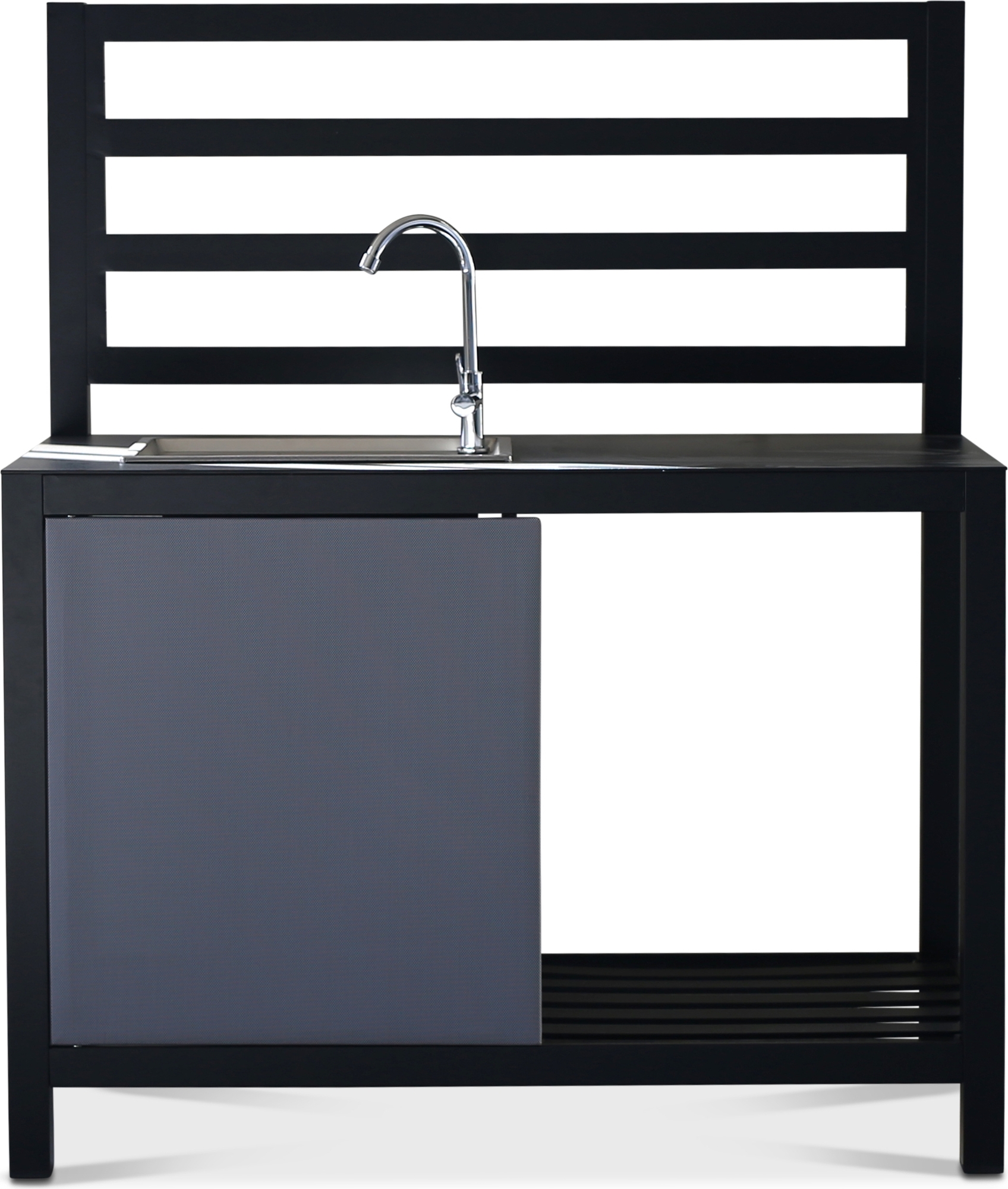 Perfekt für gemütliche Grillabende und Familienfeiern auf Balkon und Terrasse. Der Rahmen besteht aus lackiertem Metall und einer Edelstahlspüle mit Wasserhahn.