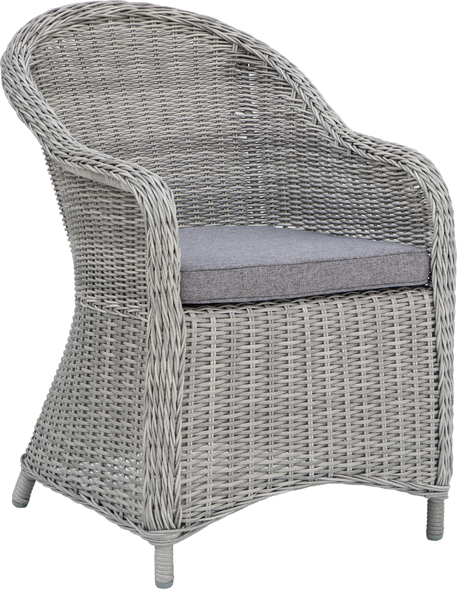 Materialien: Graues Kunstrattan (Stuhl), Polyester (Kissen)