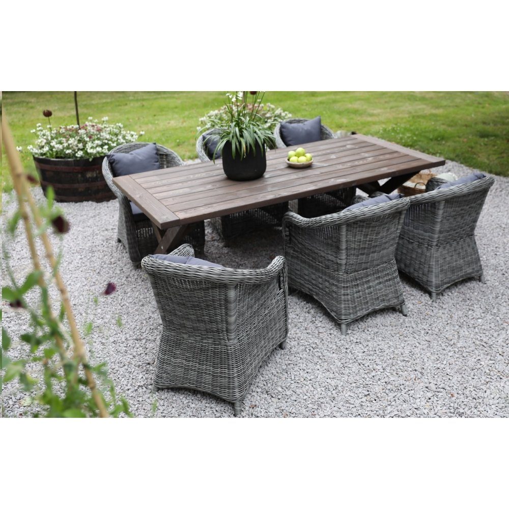 Der Tisch aus der Oxford-Serie vereint Langlebigkeit und Eleganz mit seiner robusten Konstruktion aus braun gebeiztem Holz. Die Tischplatte besteht aus breiten Dielen, die einen rustikalen und natürlichen Eindruck erzeugen, während die stabilen Kreuzbeine sowohl Stil als auch Stabilität verleihen. Das Design des Tisches macht ihn zur perfekten Wahl für größere Innenhöfe oder Terrassen, wo er eine großzügige und einladende Fläche zum Essen mit Freunden oder der Familie im Freien bietet.
