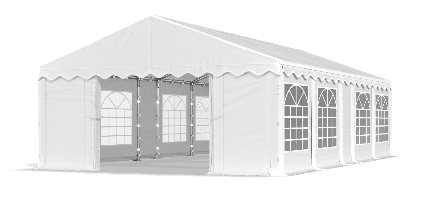 Die Seitenwände bestehen aus dicker und langlebiger PE-Plane 240 g/m² mit großem funktionalen Zierfenster mit Lamellen. Die Höhe der Wände beträgt 2 m. Durch die auf jedem Zwei-Meter-Segment angebrachten Fenster erhält das Zelt ein optisch ansprechenderes Design und eignet sich somit perfekt für Studentenfeste, Partys, Feiern sowie Ausstellungen und Veranstaltungen. Die Fenster lassen Tageslicht eindringen, was beim Aufenthalt im Freien ein angenehmes und entspannendes Gefühl vermittelt und gleichzeitig vor Ungeziefer und unerwünschter Witterung schützt. Die Wände werden an jedem Zwei-Meter-Segment mit speziellen Gummibändern befestigt, was es auch ermöglicht, Wände für zusätzliche Öffnungen frei zu entfernen, sodass Sie sie an Ihre eigenen Bedürfnisse anpassen können.