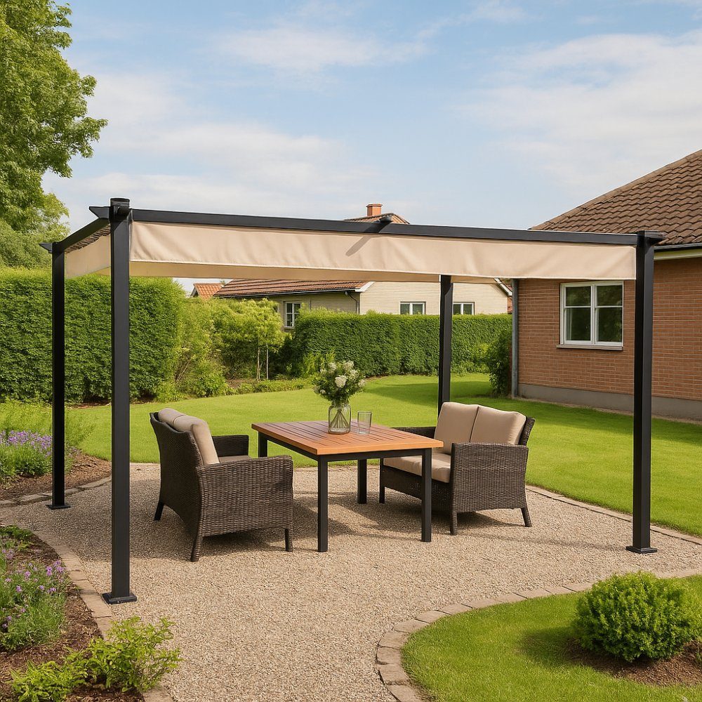 Schaffen Sie mit dieser modernen Pergola ein schattiges und angenehmes Plätzchen auf Ihrer Terrasse. Der robuste Rahmen aus dunkelgrauem Aluminium vermittelt einen stilvollen Eindruck und ist so konzipiert, dass er den Elementen standhält. Das Dach besteht aus einem beigen Polyestergewebe mit PU-Beschichtung, das sowohl vor Sonneneinstrahlung schützt als auch leichtem Regen standhält.