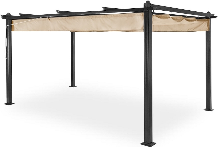 Eine stilvolle und funktionale Pergola, die auf der Terrasse angenehmen Schatten und Schutz bietet. Die Konstruktion besteht aus pulverbeschichtetem Aluminium mit dunkelgrauer Lackierung, die sowohl für Stabilität als auch für eine moderne Optik sorgt. Das beige Polyester-Dachgewebe ist mit PU beschichtet, was es wasserabweisend macht und gleichzeitig einen effektiven Sonnenschutz bietet.