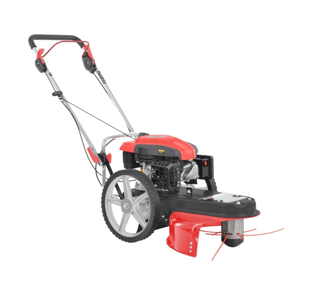 Rasentrimmer auf Rädern, besteht aus einem Standard-Trimmerdesign mit langen, robusten Trimmerfäden. Die Maschine übernimmt Trimmarbeiten, jedoch in größerem Umfang, da die Arbeitsbreite deutlich größer ist und die Arbeit effizienter macht.