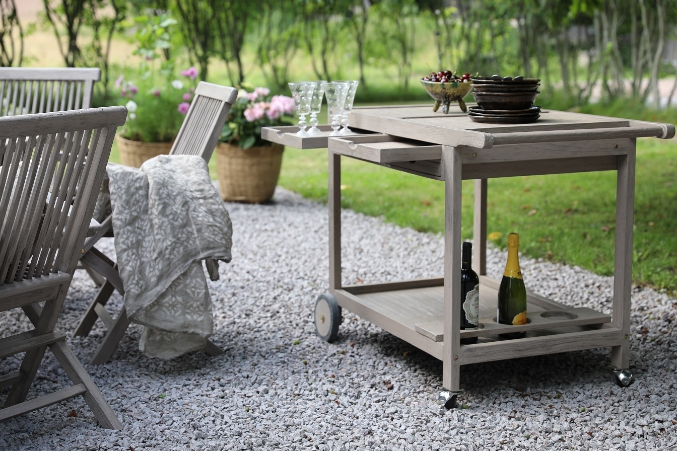 Teak ist ein hervorragendes Material für den Außenbereich, da es von Natur aus witterungsbeständig ist. Um den warmen, teakbraunen Farbton zu erhalten, empfehlen wir, den Wagen mit Teaköl zu behandeln und zu pflegen. Teaköl schützt die Oberfläche vor Feuchtigkeit und Schmutz, was die Lebensdauer der Möbel verlängert.