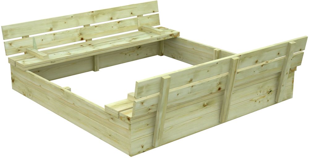 Der Sandkasten Sandy 14 ist ein robuster und geräumiger Sandkasten, der Kindern einen sicheren und unterhaltsamen Ort zum Spielen im Garten bietet. Der clevere Deckel lässt sich einfach hochklappen und in zwei bequeme Sitzbänke verwandeln, die sowohl Sitzgelegenheit als auch Schutz für den Sand bieten, wenn der Sandkasten nicht in Gebrauch ist. Dieser aus grünem, tiefimprägniertem Holz gefertigte Sandkasten ist witterungsbeständig und gewährleistet eine lange Haltbarkeit. Die natürliche Holzfarbe fügt sich gut in verschiedene Gärten ein und wird leicht zu einem beliebten Ort für Outdoor-Aktivitäten der Kinder.