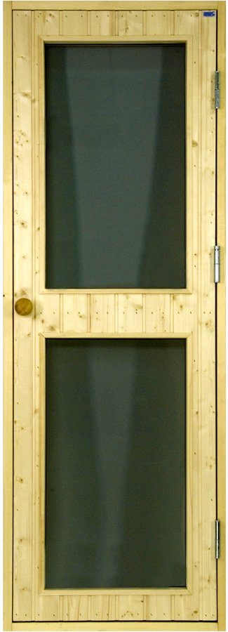 Saunatür mit 2 Glasteilen, die mit einem unbehandelten Rahmen geliefert wird, der vor der Montage geölt oder lackiert werden muss.