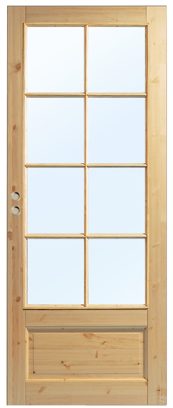 Gewöhnliche Schiebetür aus massiver Kiefer mit großem Glasausschnitt.