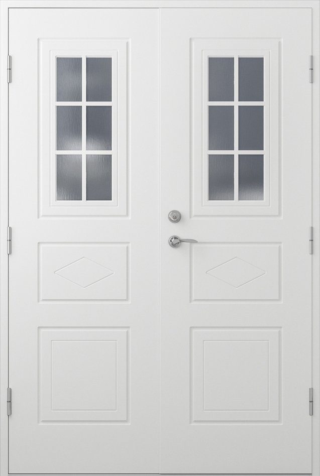 - Rahmen: Konstruktion aus Kiefernholz mit 51 mm Wärmedämmung und 0,5 mm starkem Aluminiumblech an der Innen- und Außenseite der Tür.
