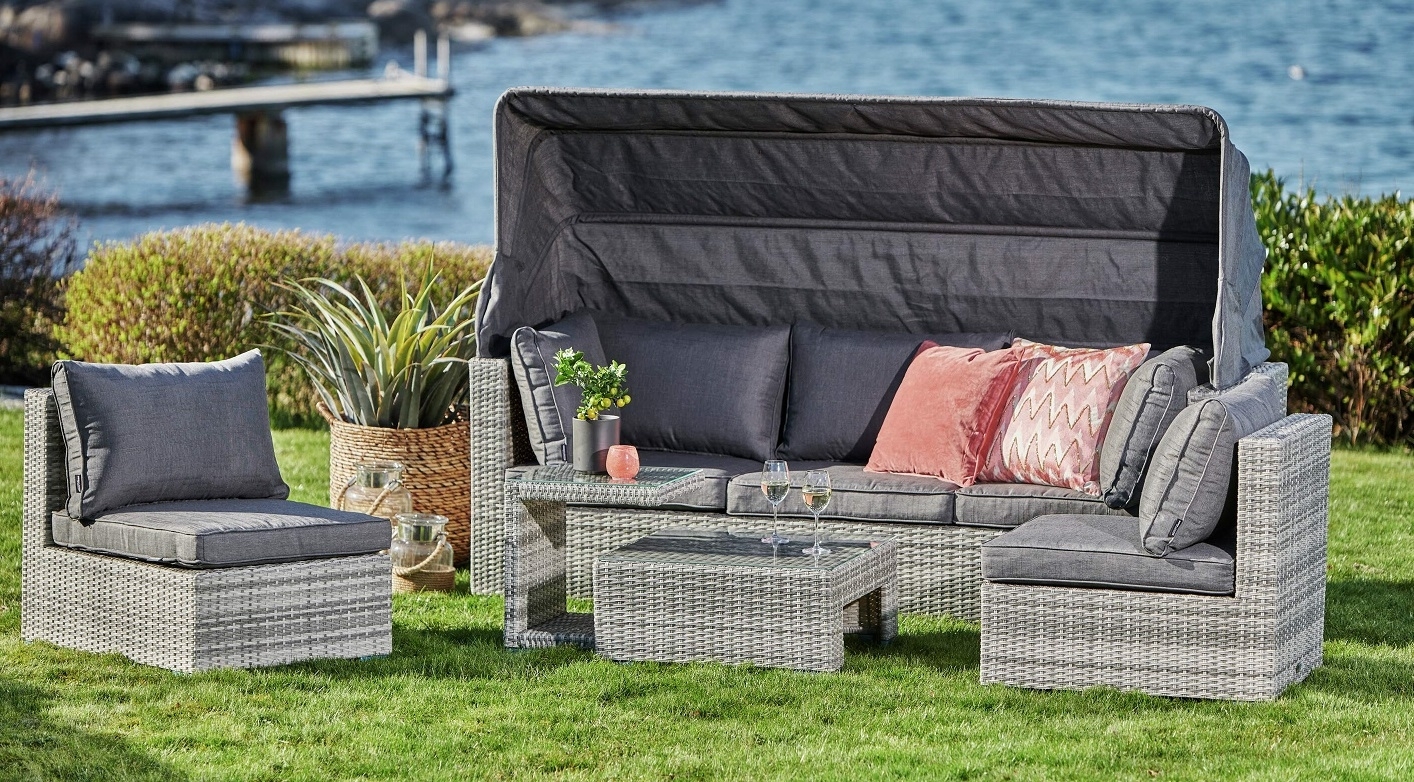 Easy Living By Martinsen , Slättvik ist ein baubares System bestehend aus Sofa mit integriertem Schiebedach, zwei Sesseln, Couchtisch und Beistelltisch. Das großzügige 3-Sitzer-Sofa verfügt über eine praktische Abdeckung zum Schutz vor der Sonne. Die beiden freistehenden Sessel können mit dem 3-Sitzer-Sofa zu einem Ecksofa ergänzt werden. Der Couchtisch und der Beistelltisch haben beide Platten aus gehärtetem Glas.
