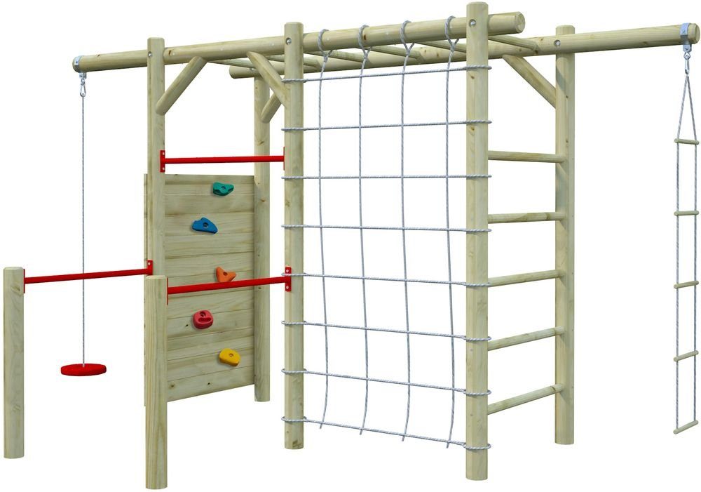 Dieser Spielständer bietet vielfältige Aktivitäten, die die motorischen Fähigkeiten und die Fantasie der Kinder anregen. Mit Schaukeln, Strickleitern, Kletternetzen und Klettersteinen können Kinder stundenlang im Garten spielen und Abenteuer erleben.