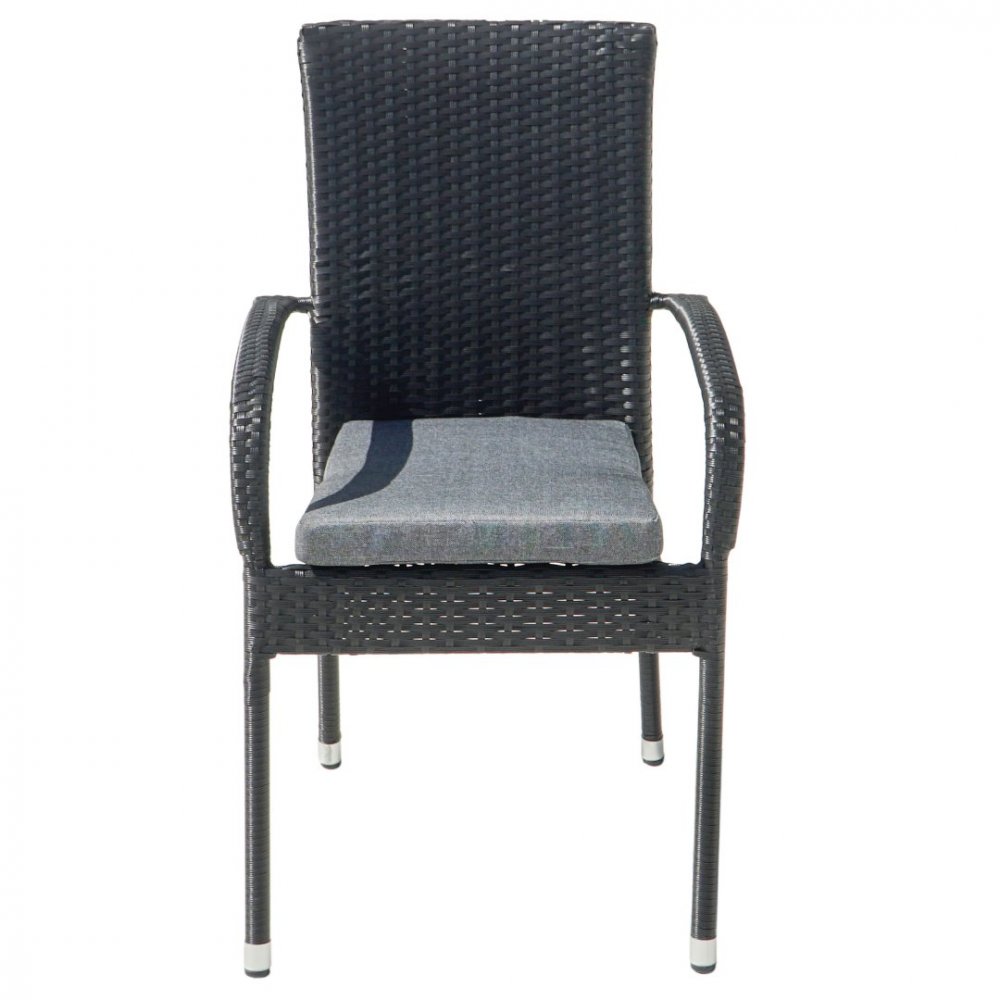 Schwarzer, stapelbarer Gartenstuhl aus synthetischem Rattan mit grauem Sitzkissen