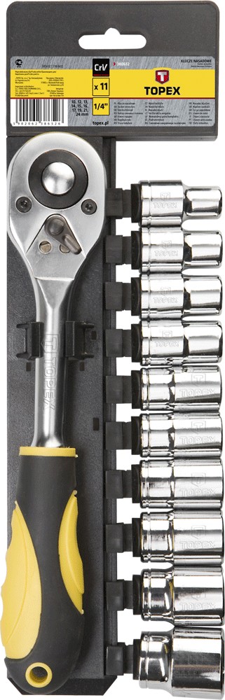 11-teiliges Set mit flexiblem Kunststoffanhänger. Alle Teile sind aus hochwertigem CrV-Stahl gefertigt.