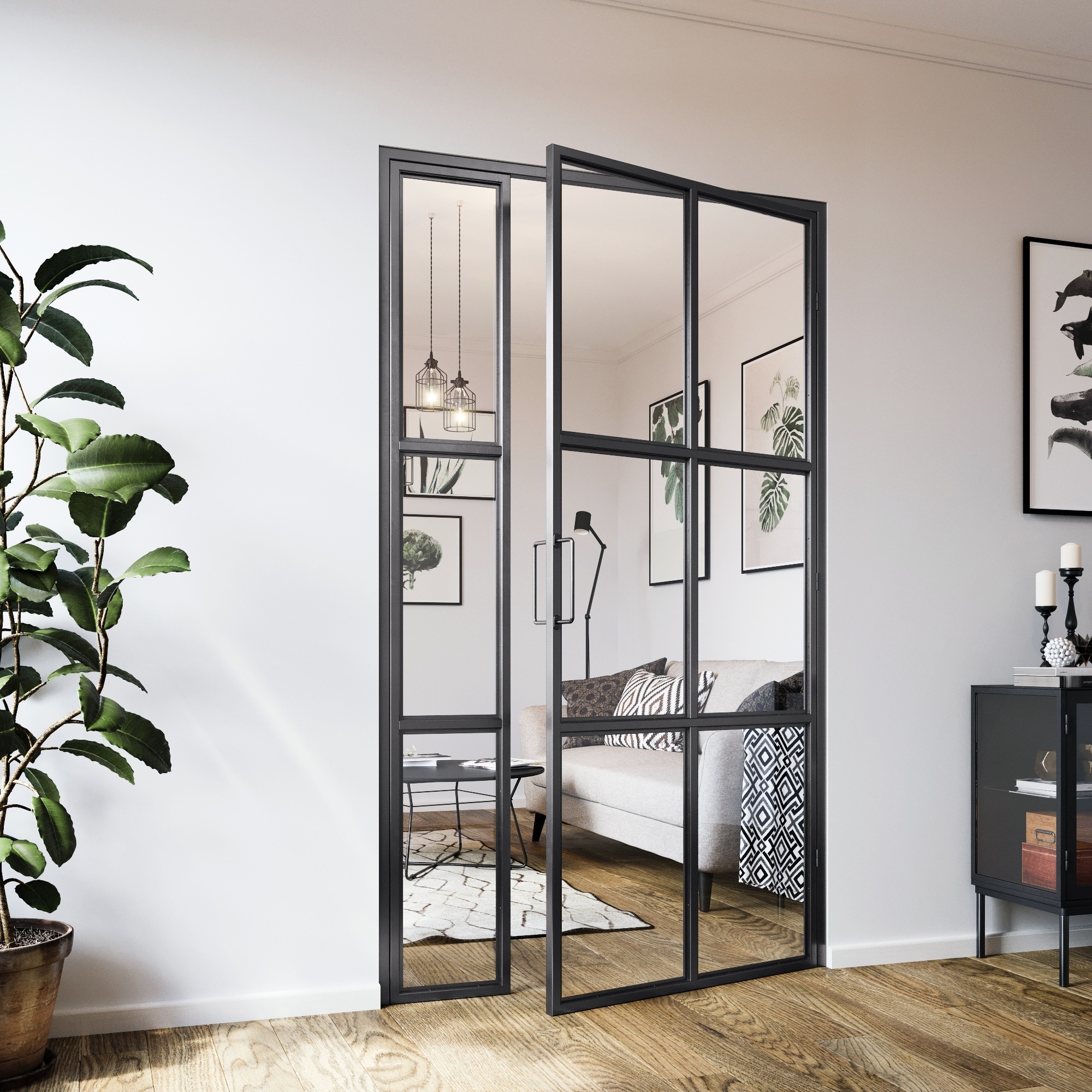 Die Tür besteht aus robustem Stahl mit rauem Industrie-Finish und die gehärteten Glasplatten (3-1-3 mm) sorgen sowohl für Haltbarkeit als auch für Stil. Das industrielle Design passt perfekt in moderne Wohnungen, Lofts oder Büroumgebungen und vermittelt ein raues, authentisches Gefühl.