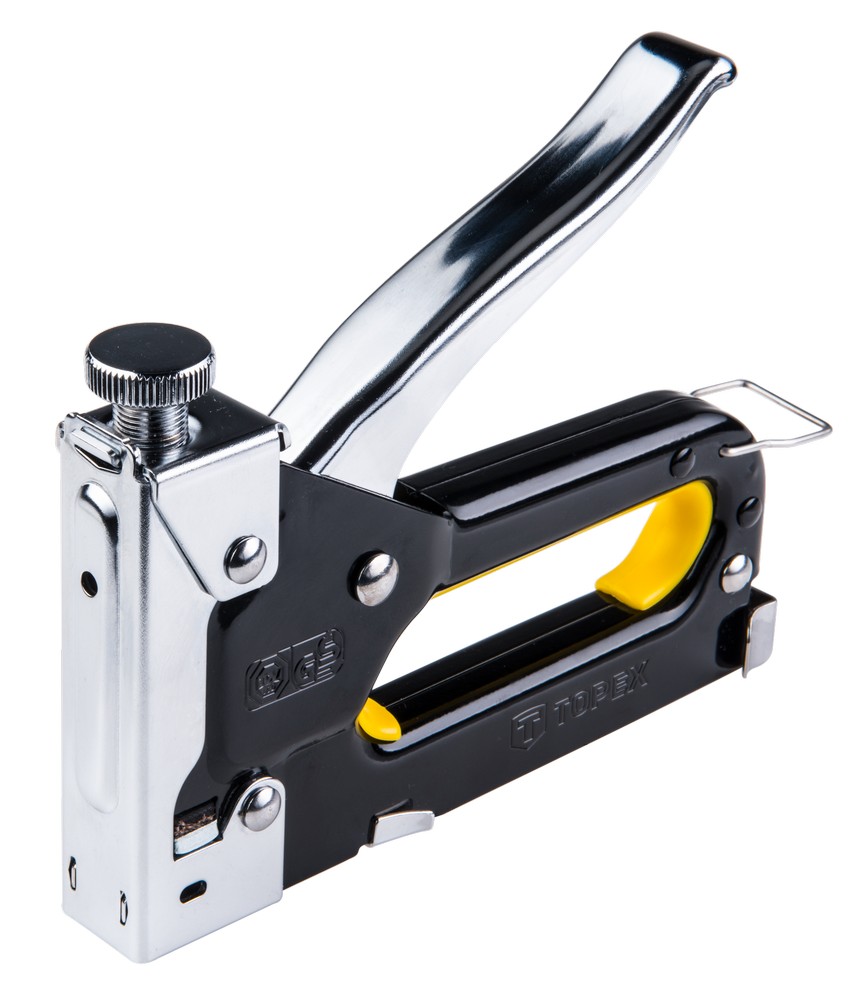 Möbeltacker für J-Clips von 6 bis 14 mm. Aus Metall gemacht. Das Werkzeug eignet sich perfekt für dekorative Zwecke, wie das Anbringen von Leder und Polstern. Die Pistole treibt die Klammer ein, ohne sie zu verbiegen, auch in harte Materialien.